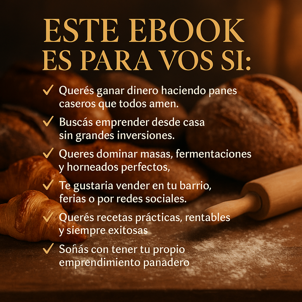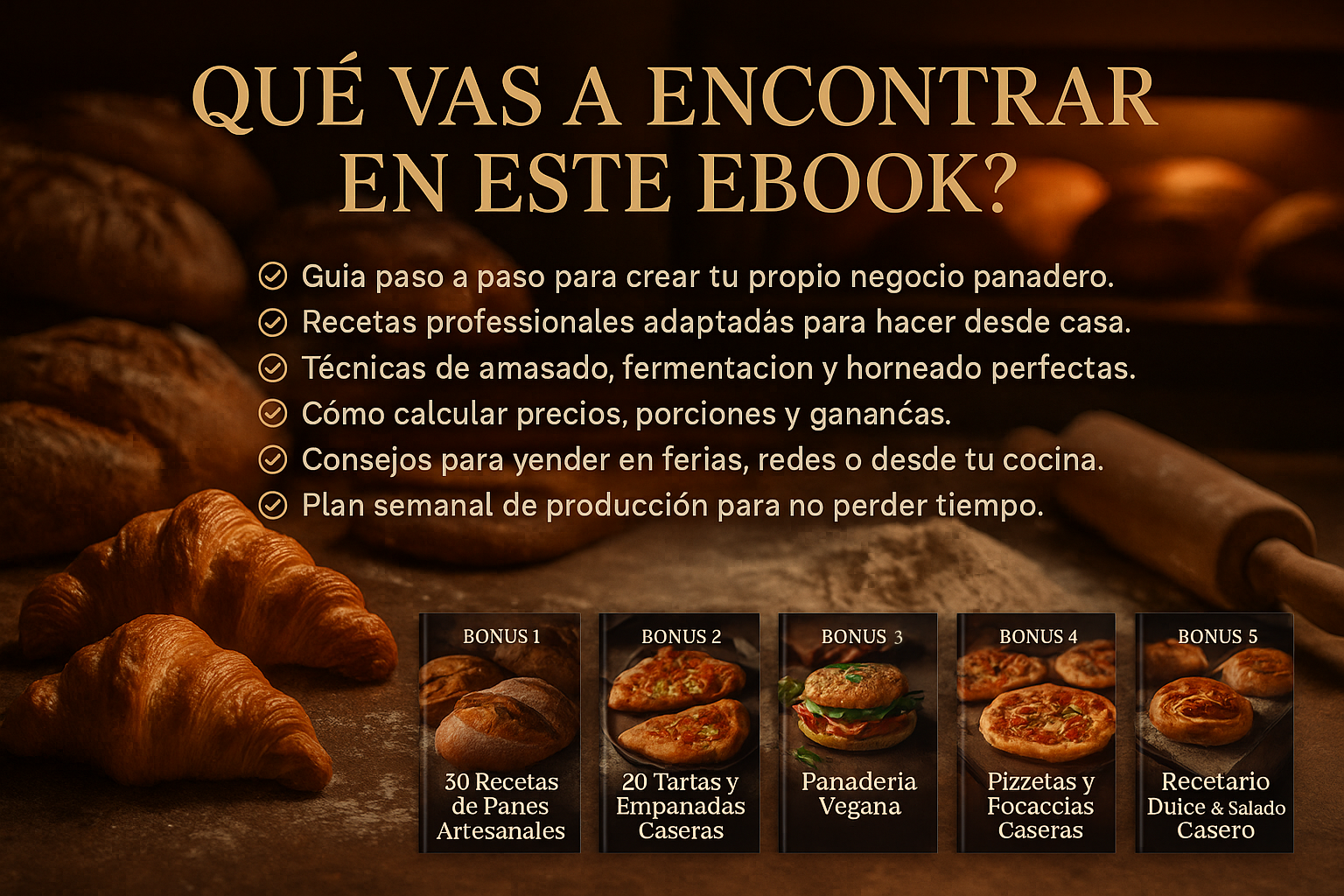 Es una guía completa para crear tu propio emprendimiento panadero desde casa, con recetas, técnicas y estrategias para generar ingresos reales.